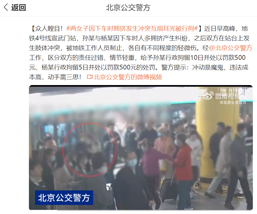 北京公交警方12月26日通报,孙某与杨某因下车时人多拥挤产生纠纷,在站台上发生肢体冲突,地铁工作人员及时制止,两人各自有不同程度的轻微伤,孙某被行政拘留10日、罚款500元,杨某被行政拘留5日、罚款500元。