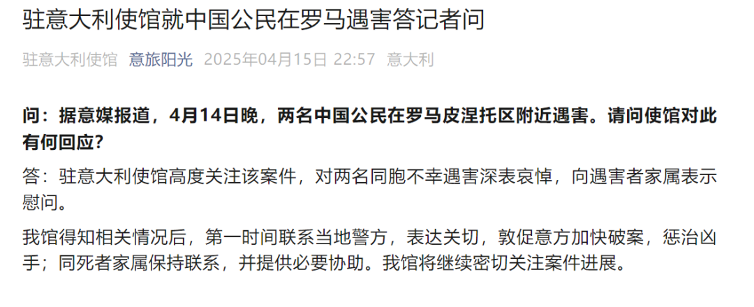 问:据意媒报道,4月14日晚,两名中国公民在罗马皮涅托区附近遇害。请问使馆对此有何回应?