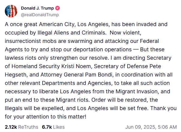 特朗普指示国土安全部长诺姆、国防部长赫格塞思和司法部长邦迪等官员,协同相关部门与机构采取一切必要行动,“将洛杉矶从移民入侵中解放出来,并结束这些移民暴乱”。