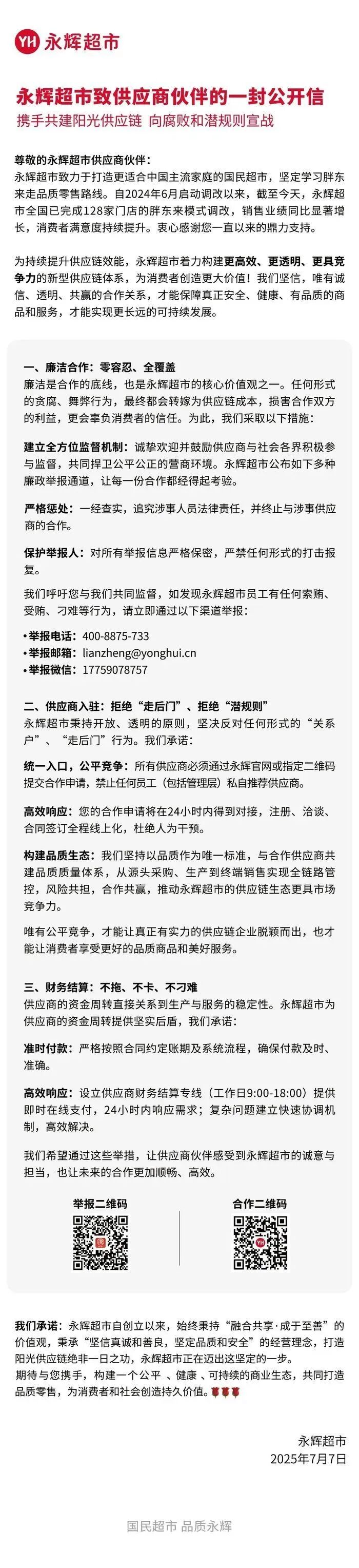 具体来看,永辉超市在公开信中表示,廉洁是合作的底线,也是永辉超市的核心价值观之一。任何形式的贪腐、舞弊行为,最终都会转嫁为供应链成本,损害合作双方的利益,更会辜负消费者的信任。
