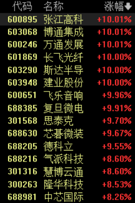 芯片概念表现活跃,张江高科、博通集成、斯达半导等多股涨停,中芯国际涨超8%股价创历史新高,寒武纪涨超3%。