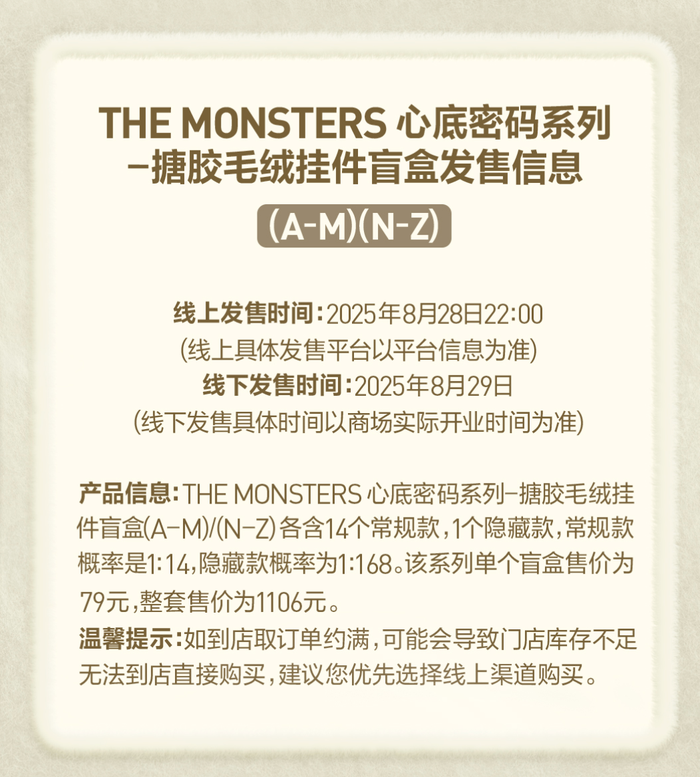 泡泡玛特“迷你版LABUBU”(THE MONSTERS心底密码系列)将于今日22时线上开售,明日(8月29日)线下开售。