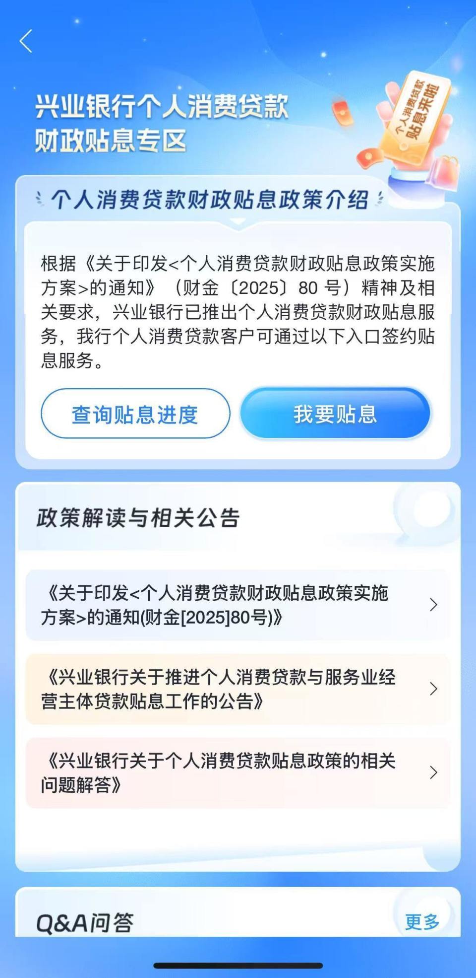 打开兴业银行“我要贷款”的菜单,下设“个人消费贷款财政贴息专区”,专区里可以申请贴息,也能查询贴息进度,还有政策解读和常见问题的详细解答。