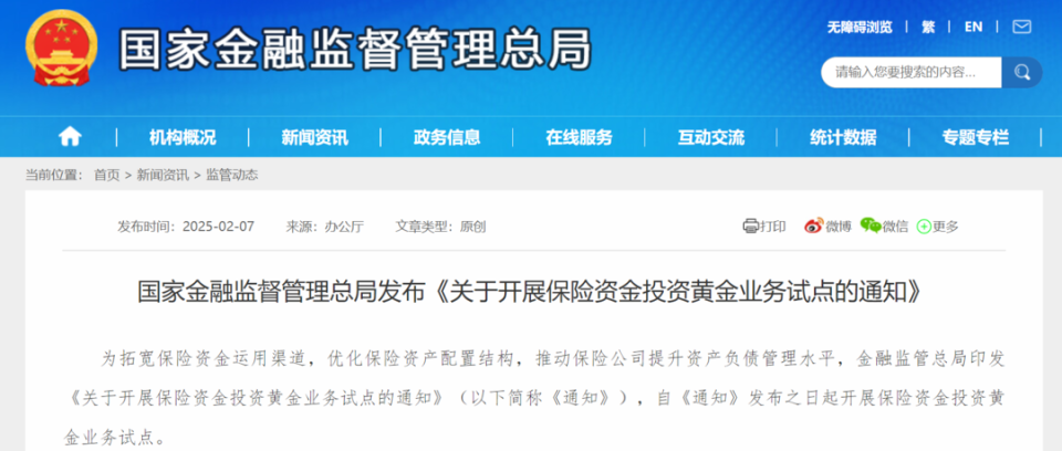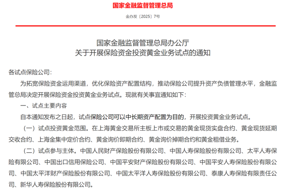 2月7日,记者从金融监管总局官网获悉,为拓宽保险资金运用渠道,优化保险资产配置结构,推动保险公司提升资产负债管理水平,近日金融监管总局印发《关于开展保险资金投资黄金业务试点的通知》(简称《通知》),自《通知》发布之日起开展保险资金投资黄金业务试点。