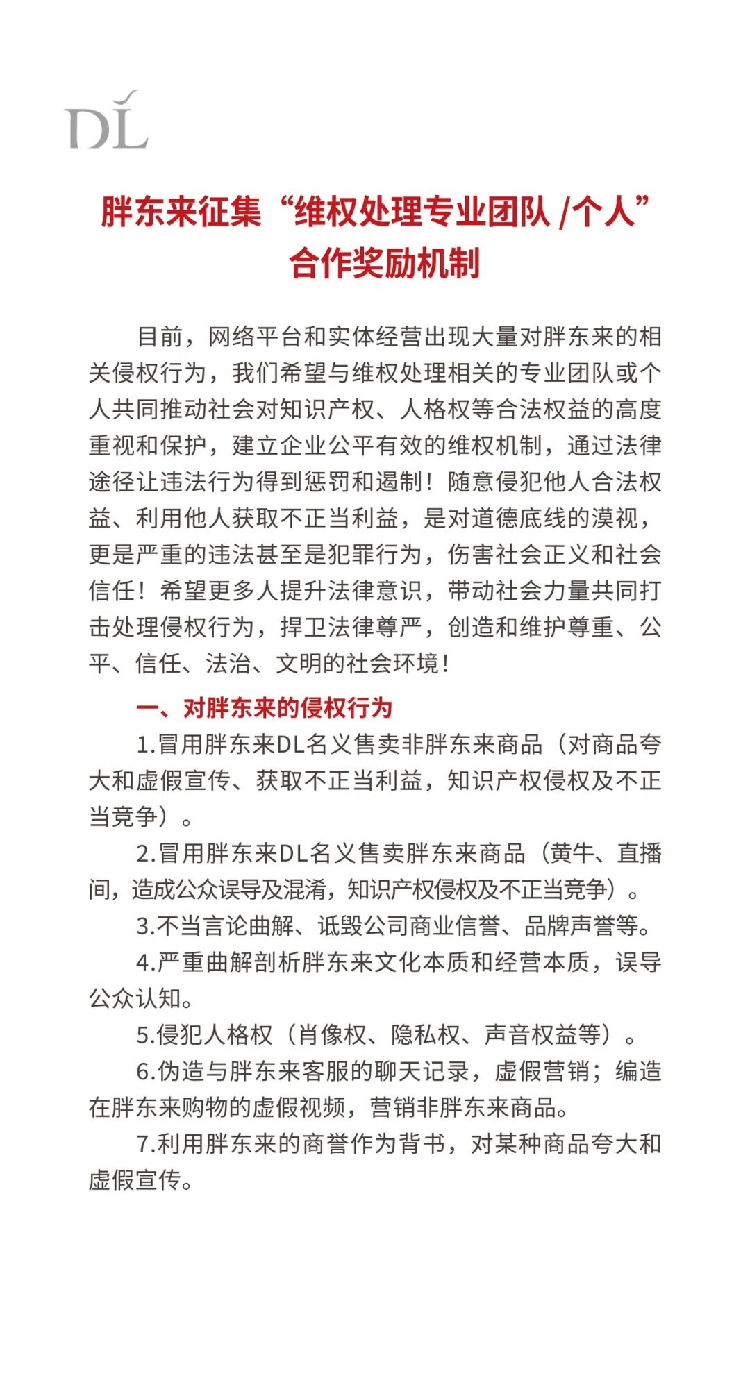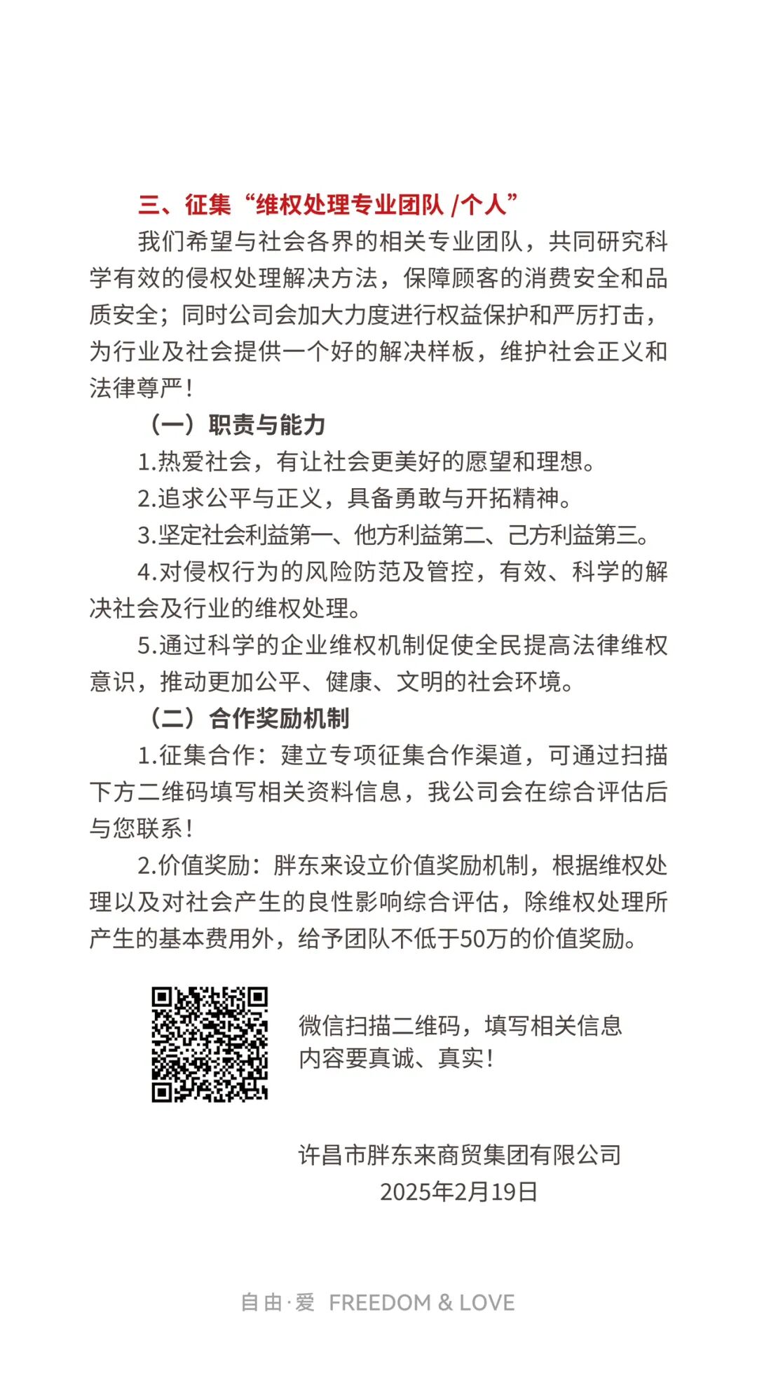2月19日晚间,胖东来公开征集“维权处理专业团队/个人”,合作奖励机制。胖东来表示,目前网络平台和实体经营出现大量对胖东来的相关侵权行为,其希望与维权处理相关的专业团队或个人共同推动社会对知识产权、人格权等合法权益的高度重视和保护,建立企业公平有效的维权机制。