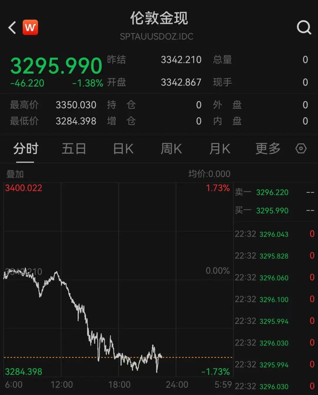 国际金价跳水。伦敦金现下跌1.38%,报3295.99美元/盎司,再度跌破3300美元/盎司;COMEX黄金期货价格下跌1.38%,报3295.9美元/盎司。