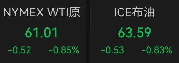国际油价下跌。NYMEX WTI原油跌0.85%,报61.01美元/桶;ICE布油下跌0.83%,报63.59美元/桶。