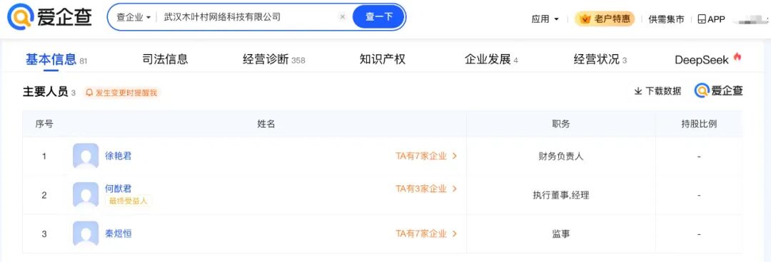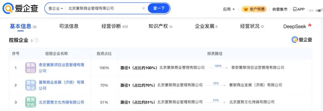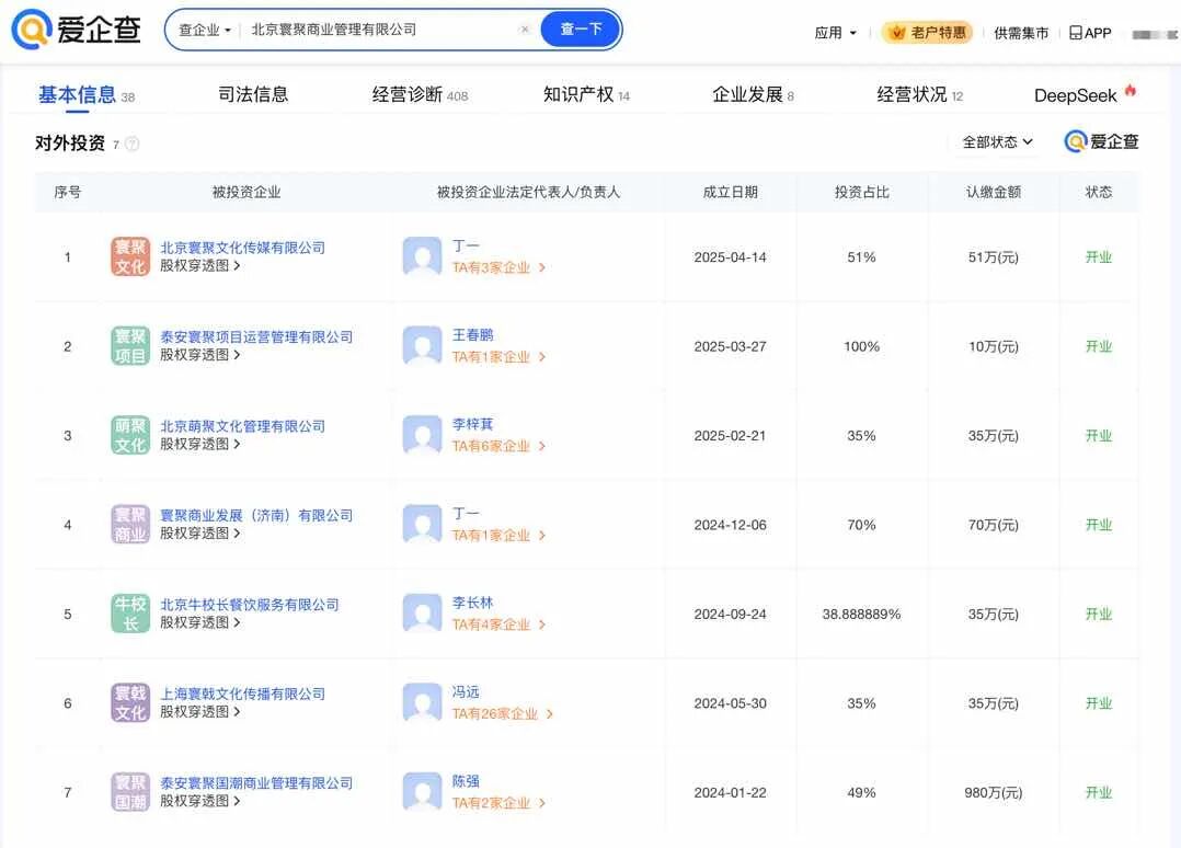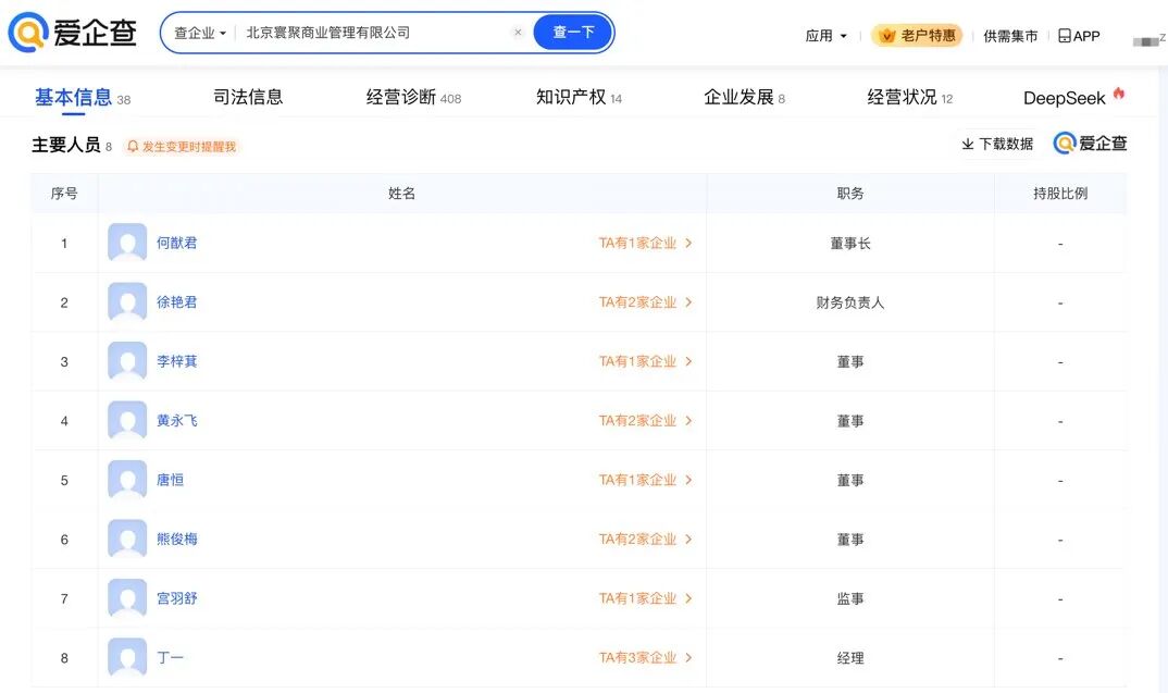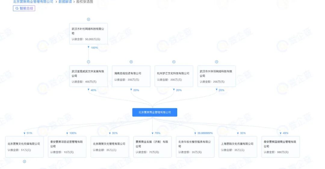 爱企查App显示,北京寰聚商业管理有限公司成立于2023年7月,法定代表人为李梓萁,注册资本1000万元人民币,经营范围包括企业管理、商业综合体管理服务、互联网销售、演出经纪、演出场所经营、互联网信息服务等。股权穿透图显示,该公司由杭州梦芒文化科技有限公司、武汉市兴华羽网络科技有限公司、武汉木叶村网络科技有限公司全资子公司武汉星竞威武文体发展有限公司等共同持股,其中,何猷君为武汉木叶村网络科技有限公司最终受益人。主要人员信息显示,何猷君任北京寰聚商业管理有限公司董事长。